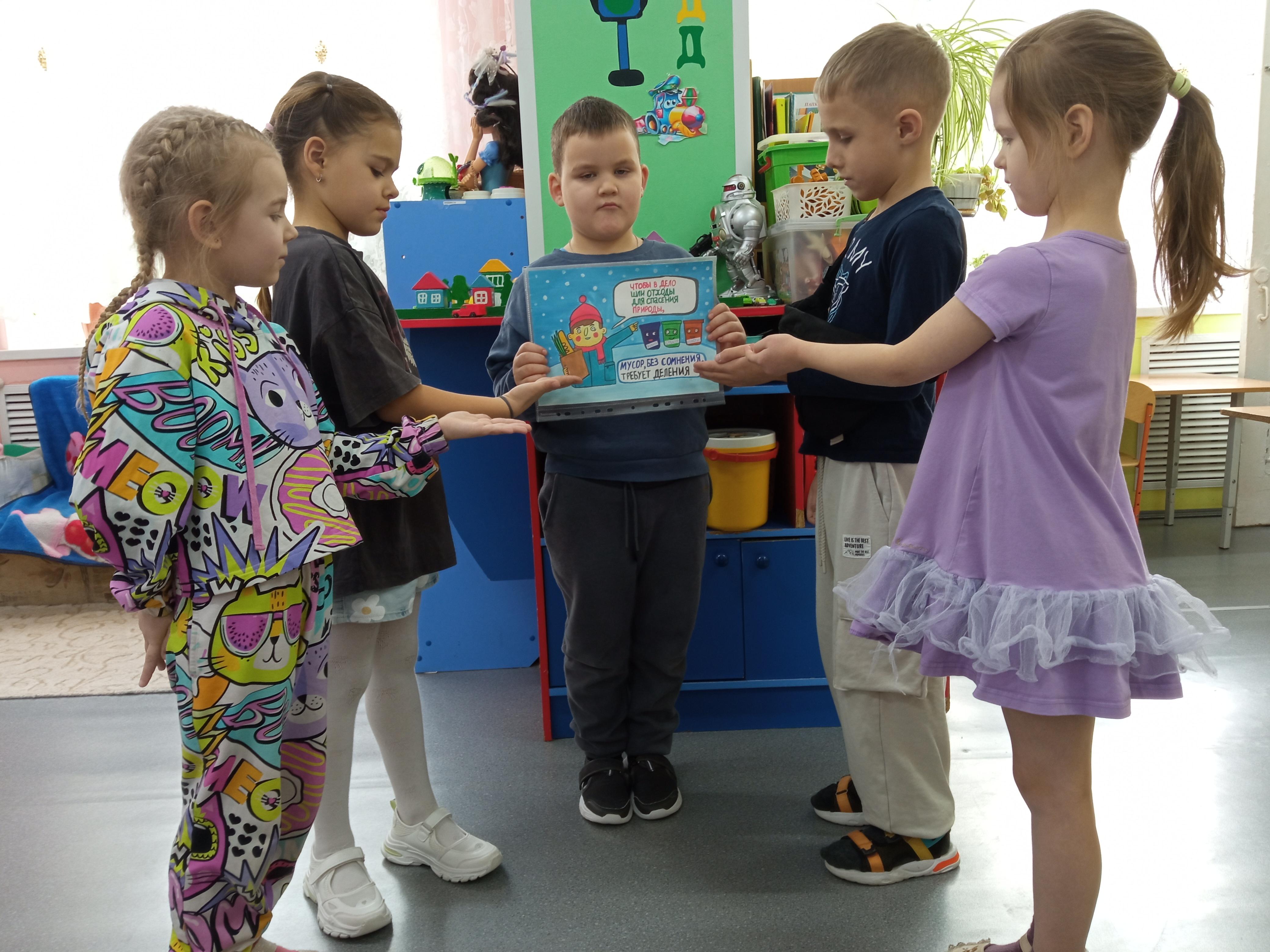 Дети учатся понимать, что мусор сортируется в специальные баки во дворах города. Обращают внимание